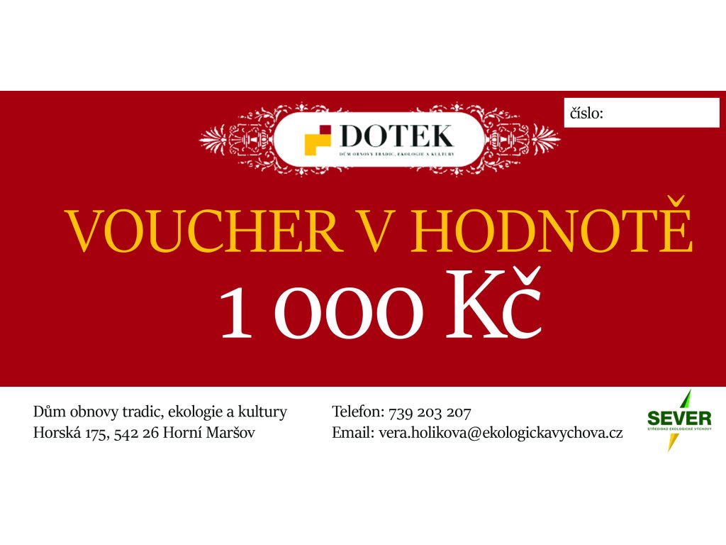 Ideální dárek pro blízké či přátelé v případě, že nechcete s výběrem šlápnout vedle.Voucher lze uplatnit na výběr zboží v e-shopu nebo v Turistickém infocentru Dotek, kde si může obdarovaný vybrat z mnoha regionálních produktů, dárečků a publikací.Voucher lze uplatnit na ubytování v krkonošském baroku nebo ve středisku Sever.Voucher lze uplatnit na produkty farské kuchyně. Obdarujte svého blízkého a my mu rádi uvaříme.Více informací ohledně naší nabídky www.dotek.eu