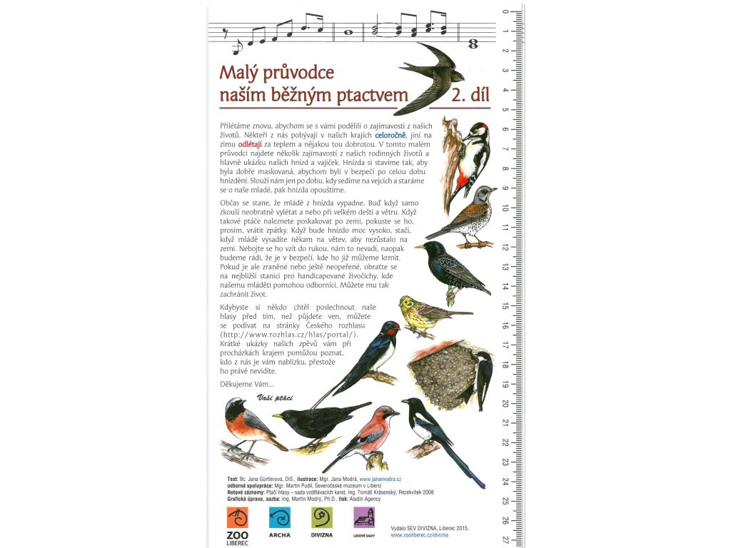 Laminovaná rozkládací skládačka obsahuje vždy 11 druhů našich nejznámějších ptáků.Z jedné strany naleznete vždy tažné ptáky, z druhé ty, kteří u nás přezimují. U každého druhu najdete kromě textu jeho vyobrazení, (v případě odlišného zbarvení obrázky obou pohlaví), dále jeho hnízdo a vajíčko ve skutečné velikosti. Na obrázcích jsou popisky vyznačeny typické poznávací znaky. Nahoře na stránce je uveden přibližný přepis zpěvu každého ptáka do not a dole vyobrazen způsob letu.Materiál je finančně podpořen z Evropského sociálního fondu OP VK.950 x 280 mm, křídový papír, skládanka, laminovánoVydal: SEV Divizna