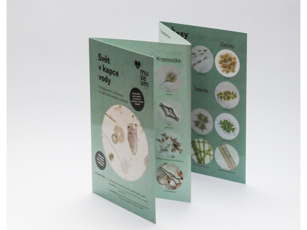 Svět v kapce vodyFotografický průvodce planktonem našich rybníkůPřipravili jsme autorskou pomůcku pro mikroskopování planktonu. Kromě fotografií zástupců sinic, řas a korýšů tu najdete také stručné informace o jednotlivých skupinách, které umožní rychle se zorientovat v zařazení organismů v ekosystému a jejich základních vlastnostech. Pro určování organismů nejsou potřeba žádné konkrétní vstupní znalosti, rozpoznávání je na základě vizuální podobnosti.Publikace je řešená jako skládací harmonika, laminovaná, aby byla odolná proti vodě i mechanickému poškození.Autorkou je Jana Kreidlová, lektorka Muzea Říčany.Formát 28×18 cm
