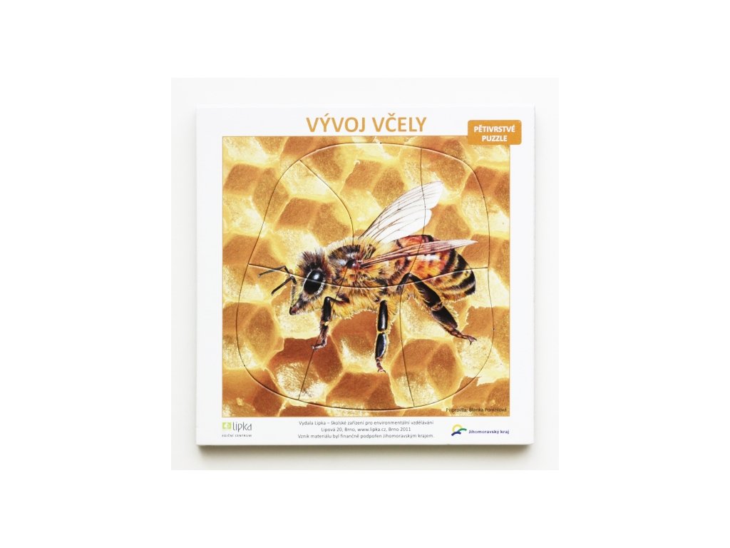 Pětivrstvé puzzle znázorňující vývoj včely – ve spodní vrstvě jsou znázorněna v buňkách, na ně se poskládají larvy, kukly, poté obrázek znázorňující líhnutí a nakonec dospělá včela.Puzzle o velikosti 16x16 cm jsou určeny především pro děti předškolního a mladšího školního věku.